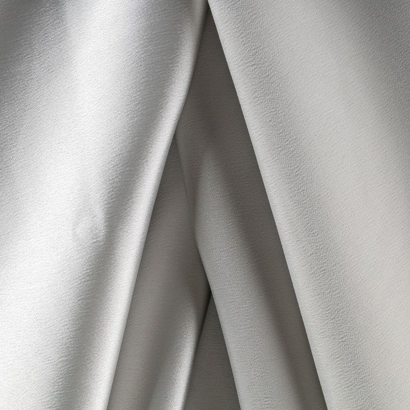 Итальянский костюмно-плательный атлас ватуссо светло-серого цвета с жемчужным оттенком. Ткань плотная, но пластичная, хорошо держит форму и отлично тянется, собирается в красивые складки и драпировки. Почти не мнется, очень удобный и практичный. Блеск умеренный, смотрится дорого, благородно. Подойдет для пошива прямых силуэтов-футляров, приталенных платьев с пышной юбкой и крупными драпировками, изделий с заложенными складками, нарядных изделий, вечерних костюмов, летнего пальто, юбки, для изготовления корсетов.