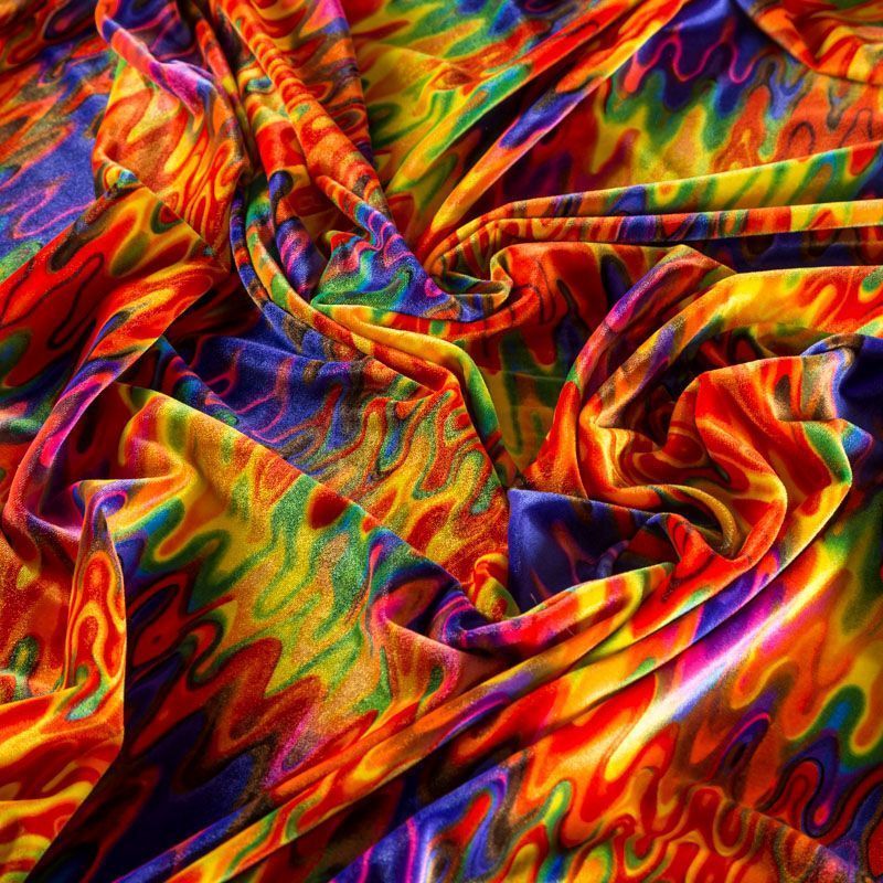 Пластичный, мягкий бархат с абстрактным дизайном в красно-оранжевых оттенках. Ткань очень приятна на ощупь, не мнется, хорошо тянется за счет эластана в составе и драпируется. Цвет играет отблесками и полутонами. Бархат идеально подходит для пошива вечерних платьев, юбок, костюмов, а также стильных аксессуаров.