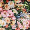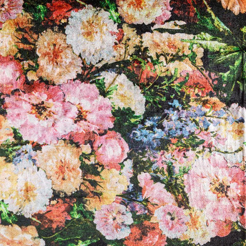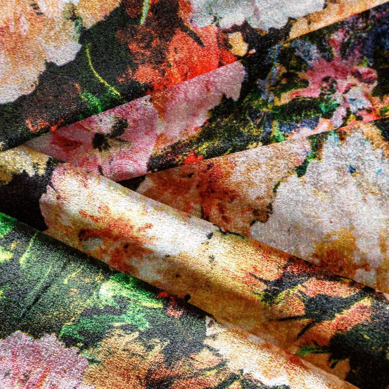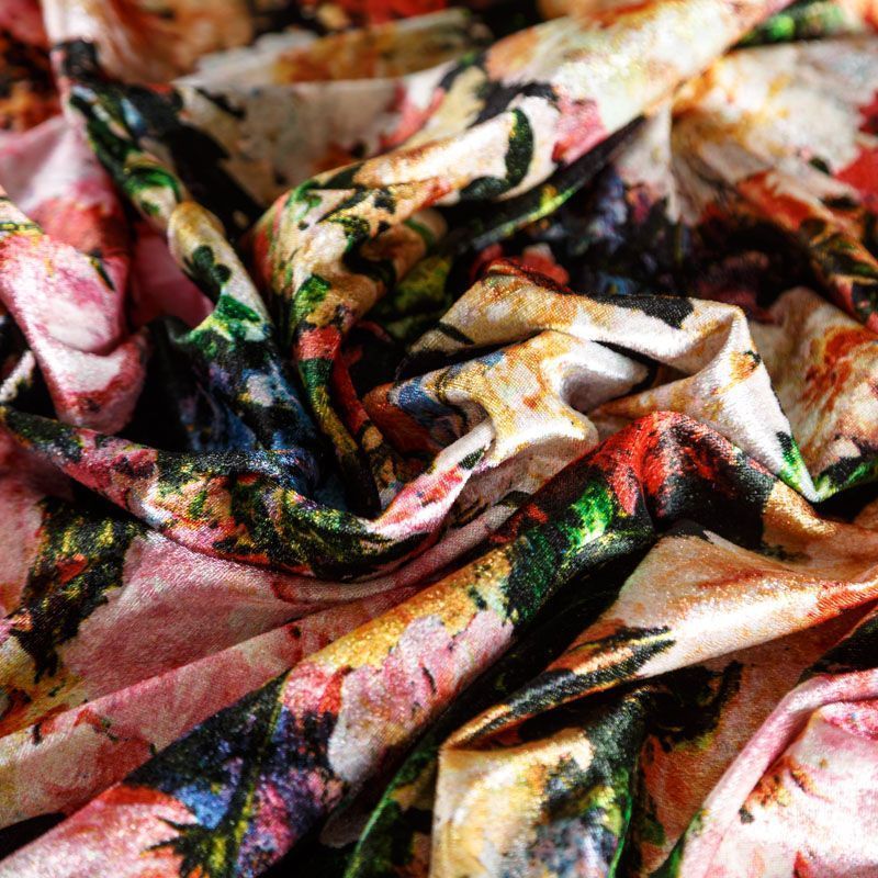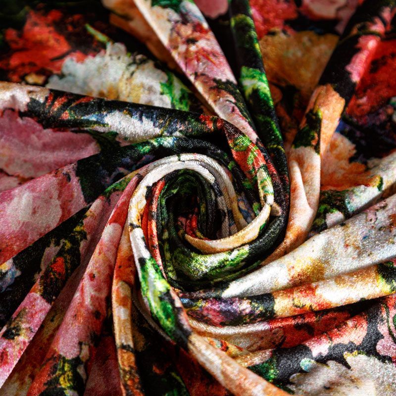 Бархат с цветочным ярким принтом. Ткань пластичная, мягкая, с коротким и блестящим ворсом, имеющим направление, очень приятная на ощупь, прекрасно драпируется, тянется за счет эластана в составе. Подойдет для платья, юбки, туники, блузки, комбинезона, свободных брюк и костюма свободного кроя.