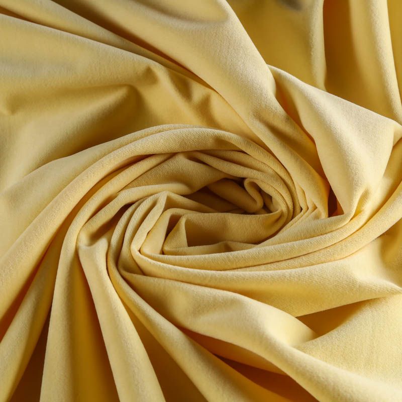 Плотный итальянский бархат из хлопка нежного оттенка мякоти банана с добавлением небольшого количества эластана. Ткань очень приятная на ощупь, пластичная, поверхность матовая, немного тянется, держит форму, прочная, износостойкая.  Идеально подойдет для нарядного костюма, жакета, юбки, жилета, комбинезона, брюк, платья-футляра.