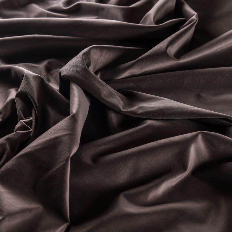 Хлопковый итальянский бархат холодного коричневого оттенка. Ткань плотная, мягкая с коротким ворсом. Не грубая, хорошо драпируется. Имеет благородный матовый оттенок. Подойдет для пошива нарядного костюма, жакета, юбки, жилета, шорт, комбинезонов, брюк, платья-футляр, легкого пальто или бомбера.