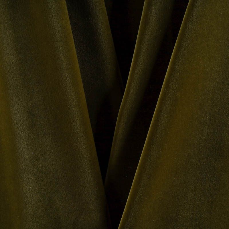 Хлопковый итальянский бархат цвета хаки зеленоватого оттенка. Ткань плотная, мягкая с коротким ворсом. Не грубая, хорошо драпируется. Имеет благородный матовый оттенок. Подойдет для пошива нарядного костюма, жакета, юбки, жилета, шорт, комбинезонов, брюк, платья-футляр, легкого пальто или бомбера.