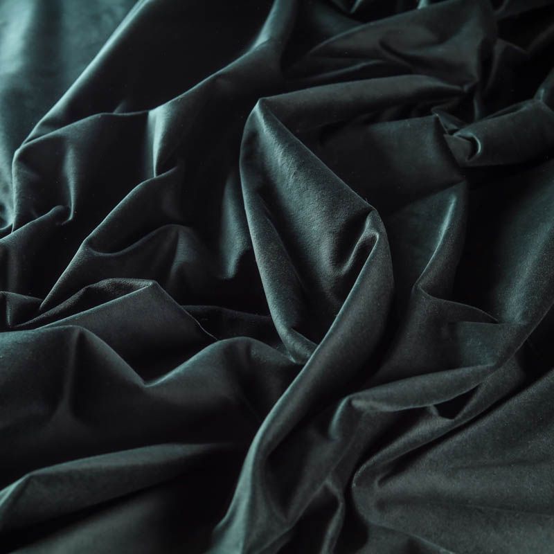 Хлопковый итальянский бархат глубокого зеленого цвета сосновой хвои. Ткань плотная, мягкая с коротким ворсом. Не грубая, хорошо драпируется. Имеет благородный матовый оттенок. Подойдет для пошива нарядного костюма, жакета, юбки, жилета, шорт, комбинезонов, брюк, платья-футляр, легкого пальто или бомбера.