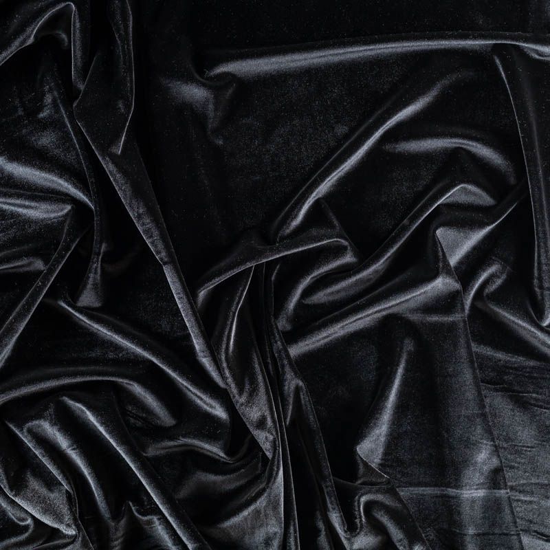 Ткань плотная, тяжелая и ниспадающая, прекрасно драпируется, хорошо тянется, не мнется. Имеет густой ворс, цвет играет отблесками и полутонами. Идеально подойдет для пошива длинных облегающих вечерние нарядов, платья с драпировками, брюк, юбок, свитшотов, костюмов в спортивном и пижамном стиле.