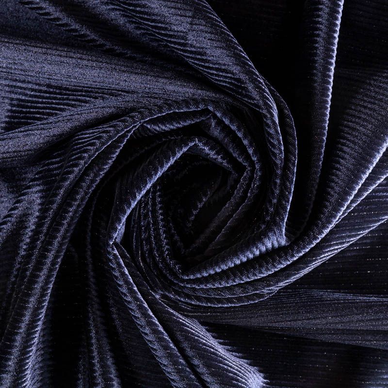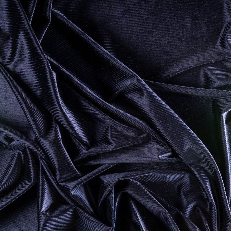 Бархат с выработкой в рубчик, как на вельвете глубокого синего цвета с люрексовой нитью. Ткань очень приятна на ощупь, не мнется, мягкая, нежная, хорошо тянется и драпируется. Цвет играет отблесками и полутонами. Бархат идеально подходит для пошива вечерних платьев, юбок, костюмов, а также стильных аксессуаров.