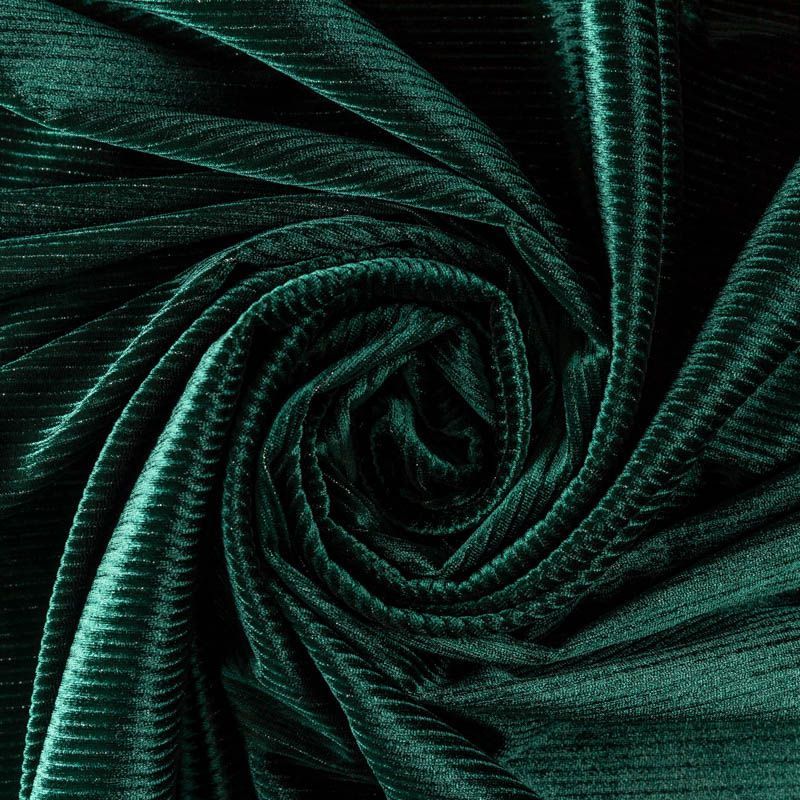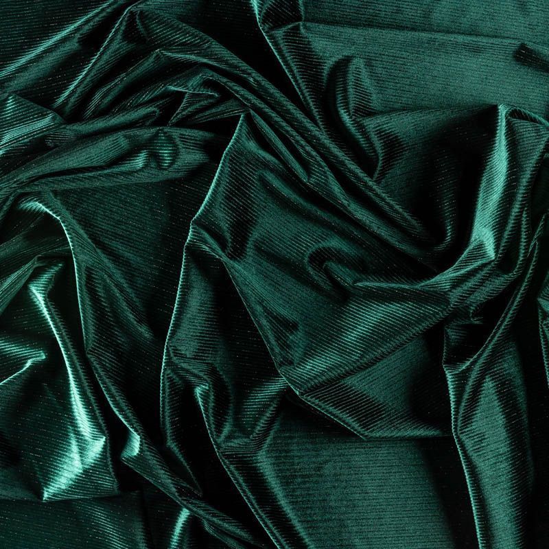 Бархат с выработкой в рубчик, как на вельвете глубокого изумрудного цвета с люрексовой нитью. Ткань очень приятна на ощупь, не мнется, мягкая, нежная, хорошо тянется и драпируется. Цвет играет отблесками и полутонами. Бархат идеально подходит для пошива вечерних платьев, юбок, костюмов, а также стильных аксессуаров.