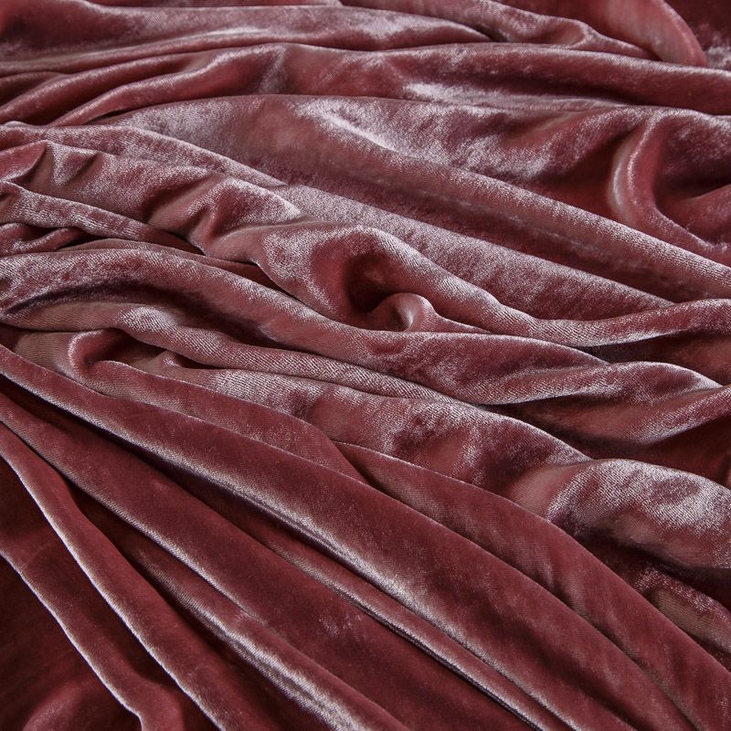 Итальянский бархат из шелка и вискозы. Ткань средней плотности, мягкая и гладкая на ощупь, с легким блеском, хорошо драпируется, струится. Идеальна для пошива платья, юбки, костюма в пижамном стиле, кимоно, туники.