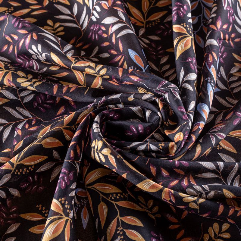 Итальянский хлопковый батист с растительным принтом в бежево-коричневых оттенках на черном фоне. Ткань очень легкая, прозрачная, приятная на ощупь, нежная, пластичная, хорошо и мягко драпируется, летящая. Батист подойдёт для модных блуз с объёмными рукавами, летних платьев и сарафанов с длинной летящей юбкой, прозрачных рубашек, декорированных объёмными бантами, туник и топов.