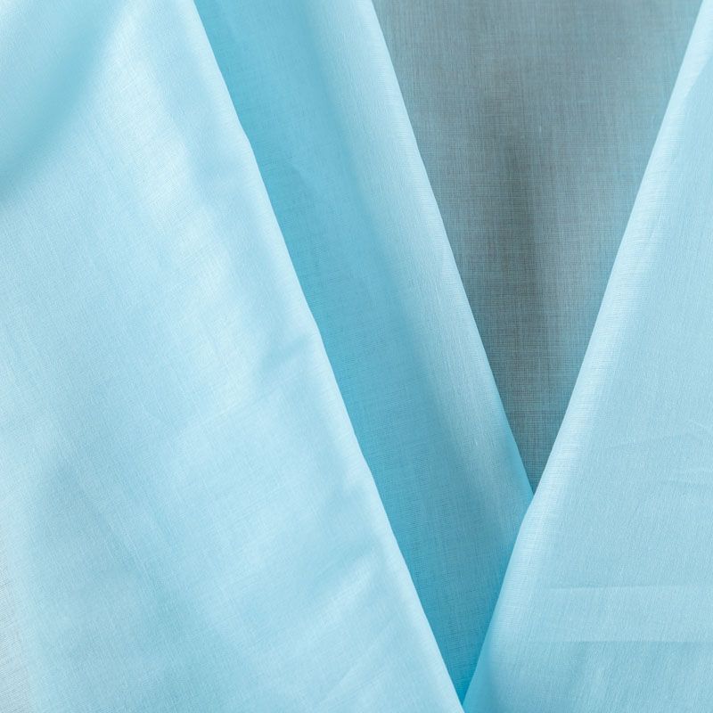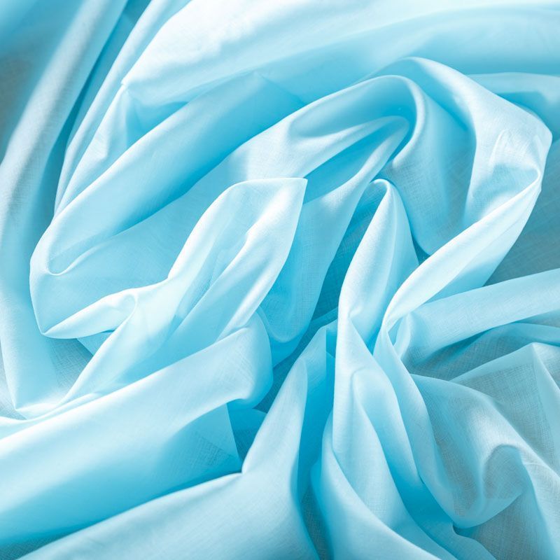 Итальянский хлопковый батист в голубом оттенке, тонкий, легкий, полупрозрачный, приятный на ощупь, нежный, хорошо и мягко драпируется, летящий. Батист подойдёт для модных блуз с объёмными рукавами, летних платьев и сарафанов с длинной летящей юбкой, прозрачных рубашек, декорированных объёмными бантами, детской одежды.