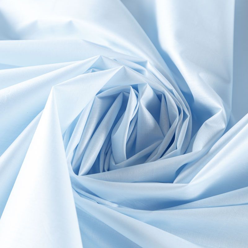 Итальянский хлопковый батист в голубом оттенке, тонкий, легкий, полупрозрачный, приятный на ощупь, нежный, хорошо и мягко драпируется, тянется за счет эластана в составе. Батист подойдёт для модных блуз с объёмными рукавами, летних платьев и сарафанов с длинной летящей юбкой, прозрачных рубашек, декорированных объёмными бантами, детской одежды.