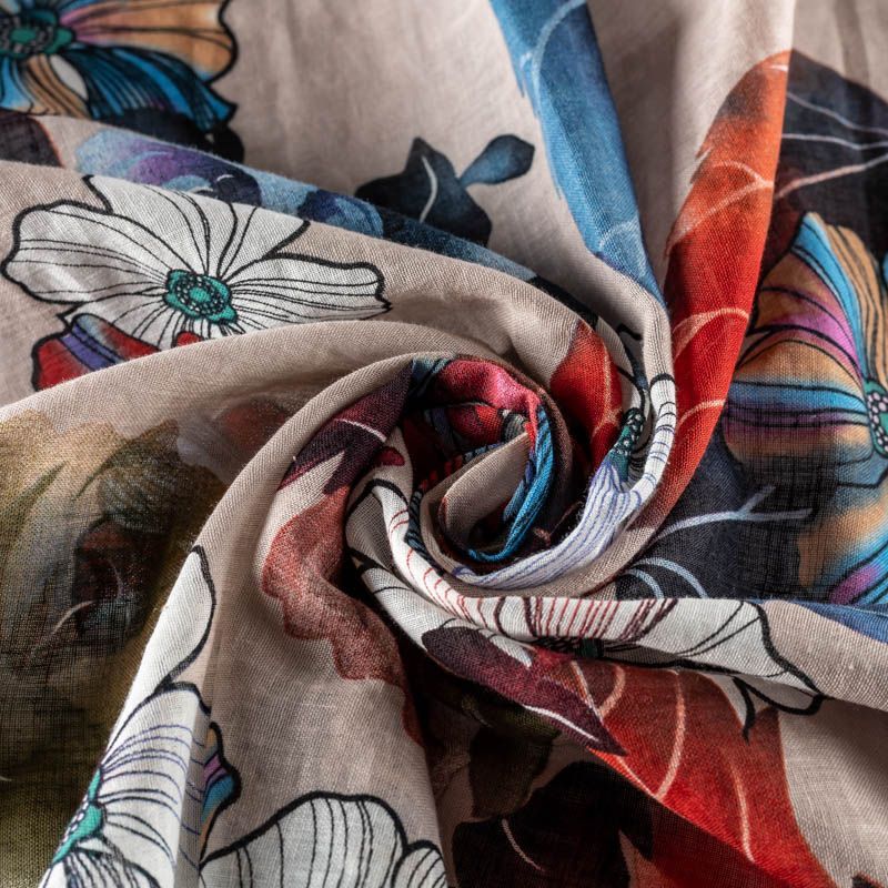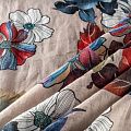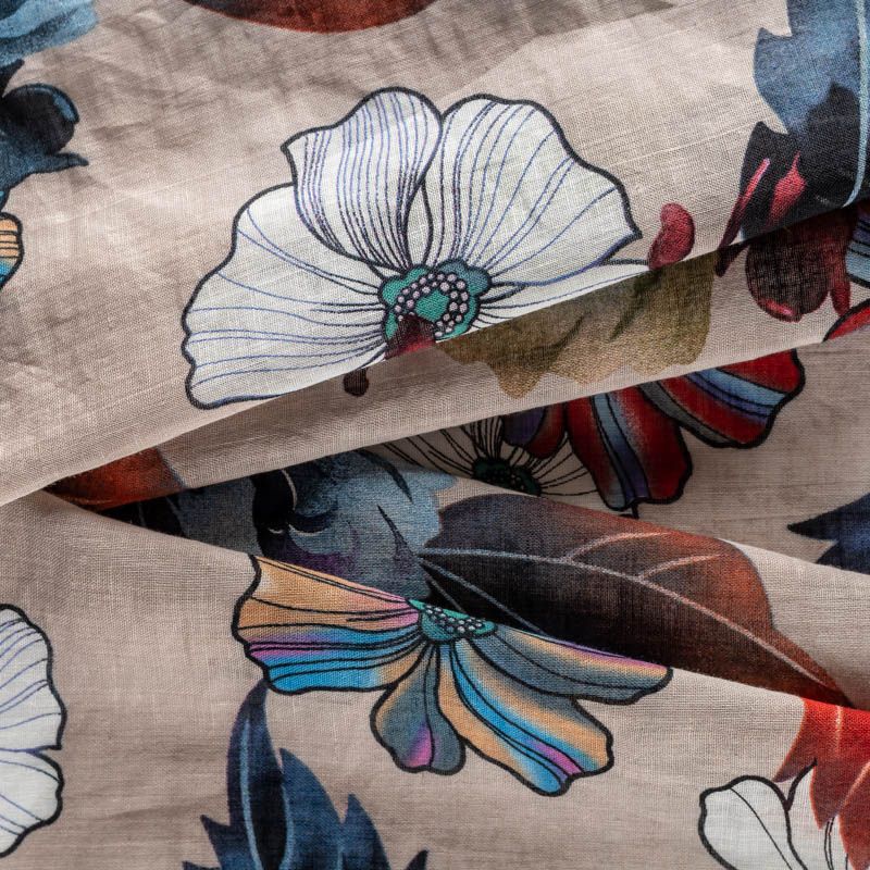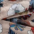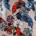 Ткань полупрозрачная, приятная на ощупь, нежная, хорошо и мягко драпируется, летящая. Хлопковый батист подойдёт для модных блуз с объёмными рукавами, летних платьев и сарафанов с длинной летящей юбкой, прозрачных рубашек, декорированных объёмными бантами. Принт с изображением крупных ярких цветов с листьями в красно-бордовых, синих и белых оттенках на фоне светлого холодного бежевого цвета.