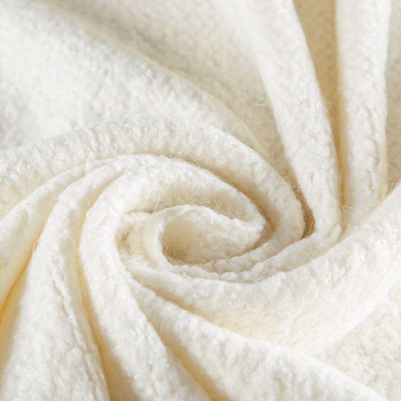 Итальянское шерстяное букле с кашемиром молочного оттенка. Ткань очень мягкая, достаточно плотная, пластичная, на вид объемная, хорошо держит тепло. Красивая фактура из кудрявого ворса эффектно будет смотреться в таких изделиях как пальто на осень, жакет, жилет, бомбер, куртка-рубашка.
