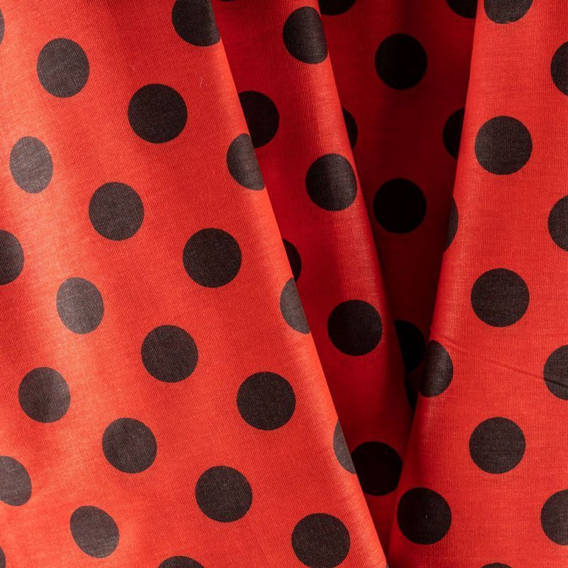 Плотная натуральная ткань с особым принципом переплетения нитей: крест-накрест. Имеет гладкую матовую поверхность чуть шероховатую на ощупь, не тянется, немного просвечивает. Прочная и стойкая к износу, надолго сохраняет яркость красок, не растягивается при стирке, практически не мнется. Черный крупный горох (2,5 см) на ярком красном фоне имитирует окрас божьей коровки и прекрасно подойдет для пошива постельного белья, изготовления пеленок, бортиков для кроватки, домашней одежды и других предметов интерьера.