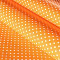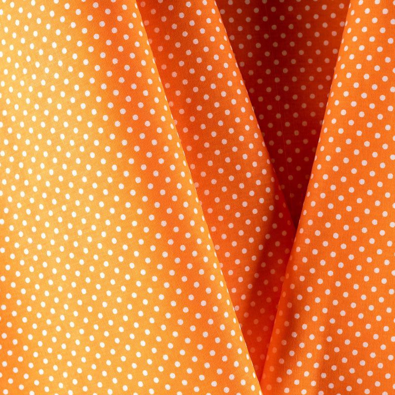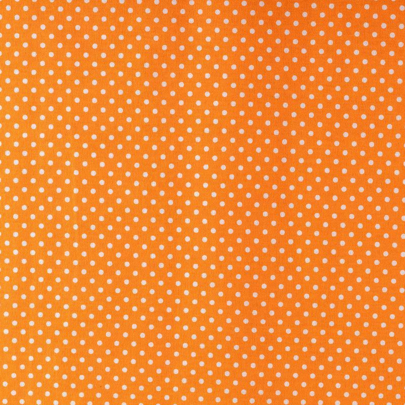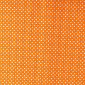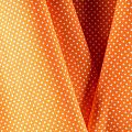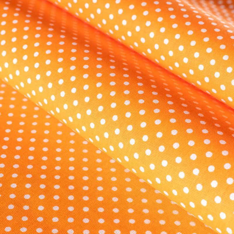 Плотная натуральная ткань с особым принципом переплетения нитей: крест-накрест. Имеет гладкую матовую поверхность чуть шероховатую на ощупь, не тянется, немного просвечивает. Прочная и стойкая к износу, надолго сохраняет яркость красок, не растягивается при стирке, практически не мнется. Мелкий белый горошек (3 мм) на ярком, сочном оранжевом фоне прекрасно подойдет для пошива постельного белья, изготовления пеленок, бортиков для кроватки, домашней одежды и других предметов интерьера.