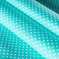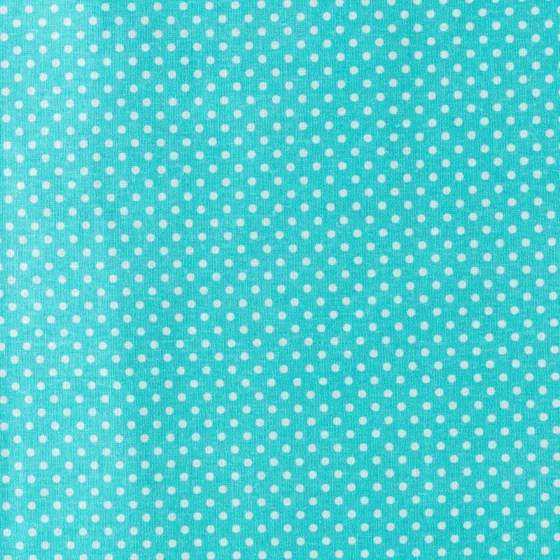 Плотная натуральная ткань с особым принципом переплетения нитей: крест-накрест. Имеет гладкую матовую поверхность чуть шероховатую на ощупь, не тянется, немного просвечивает. Прочная и стойкая к износу, надолго сохраняет яркость красок, не растягивается при стирке, практически не мнется. Мелкий белый горошек (3 мм) на ярком мятно-бирюзовом фоне прекрасно подойдет для пошива постельного белья, изготовления пеленок, бортиков для кроватки, домашней одежды и других предметов интерьера.