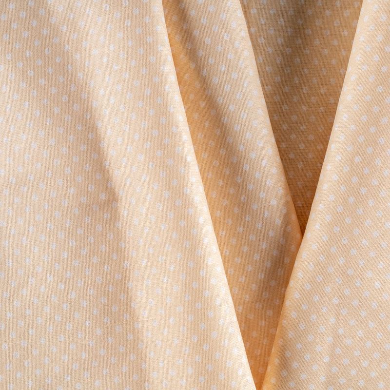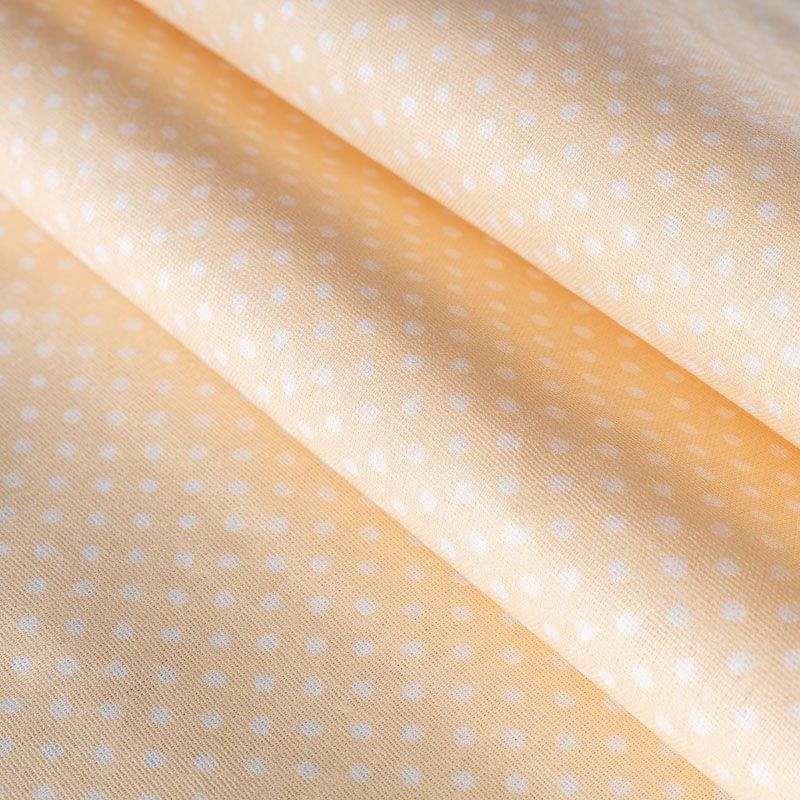 Плотная натуральная ткань с особым принципом переплетения нитей: крест-накрест. Имеет гладкую матовую поверхность чуть шероховатую на ощупь, не тянется, немного просвечивает. Прочная и стойкая к износу, надолго сохраняет яркость красок, не растягивается при стирке, практически не мнется. Мелкий белый горошек (3 мм) на пастельном дынном фоне прекрасно подойдет для пошива постельного белья, изготовления пеленок, бортиков для кроватки, домашней одежды и других предметов интерьера.
