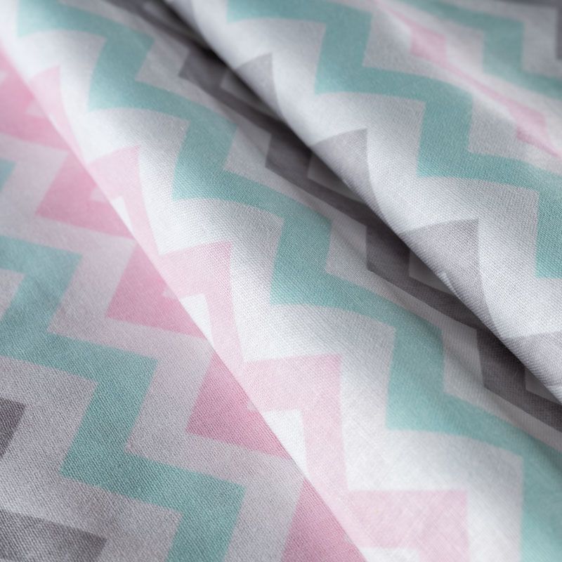 Плотная натуральная ткань с особым принципом переплетения нитей: крест-накрест. Имеет гладкую матовую поверхность чуть шероховатую на ощупь, не тянется, немного просвечивает. Прочная и стойкая к износу, надолго сохраняет яркость красок, не растягивается при стирке, практически не мнется. Нежный принт в пастельных тонах в виде зигзага на белом фоне прекрасно подойдет для пошива постельного белья, изготовления пеленок, бортиков для кроватки и других предметов домашней одежды и интерьера.