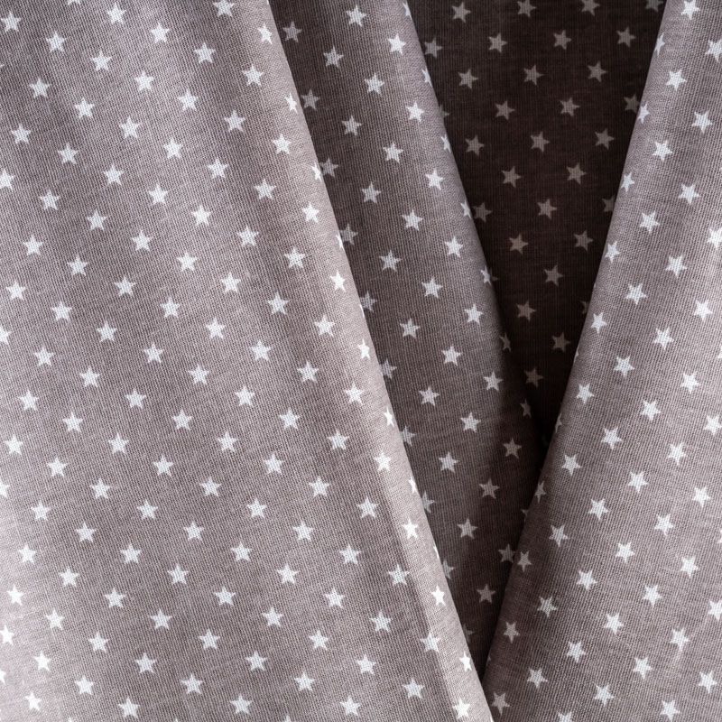 Плотная натуральная ткань с особым принципом переплетения нитей: крест-накрест. Имеет гладкую матовую поверхность чуть шероховатую на ощупь, не тянется, немного просвечивает. Прочная и стойкая к износу, надолго сохраняет яркость красок, не растягивается при стирке, практически не мнется. Принт в виде мелких белых звездочек на фоне серо-бежевого оттенка прекрасно подойдет для пошива постельного белья, изготовления пеленок, бортиков для кроватки, домашней одежды и других предметов интерьера.