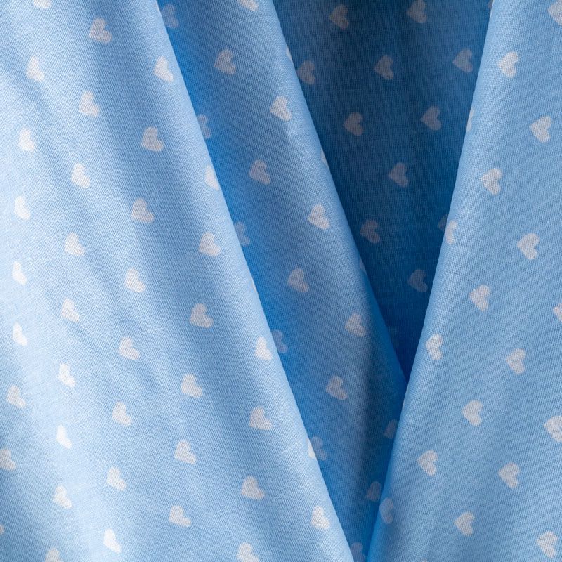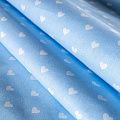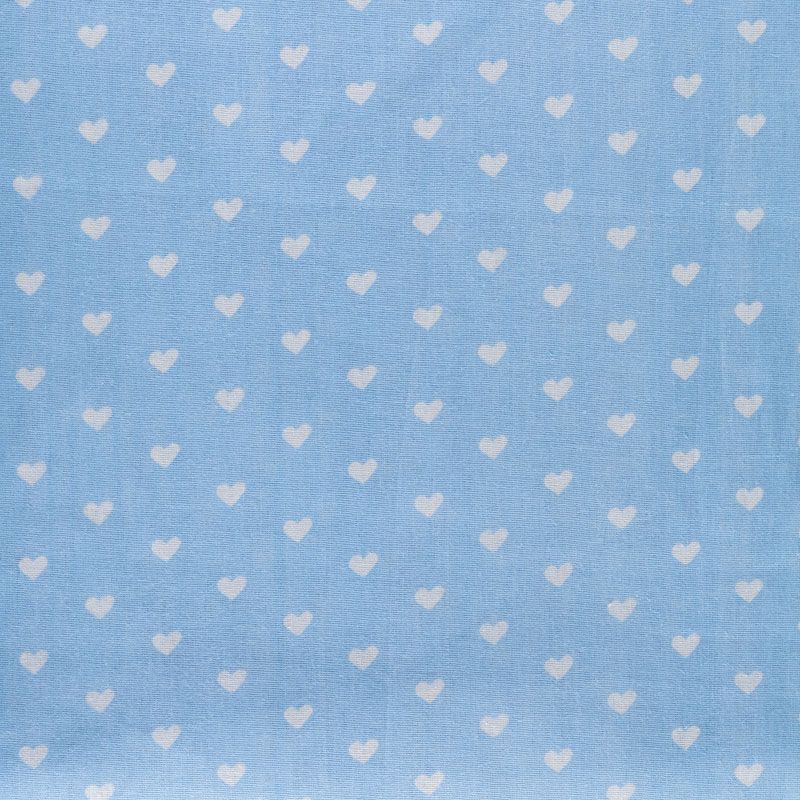 Плотная натуральная ткань с особым принципом переплетения нитей: крест-накрест. Имеет гладкую матовую поверхность чуть шероховатую на ощупь, не тянется, немного просвечивает. Прочная и стойкая к износу, надолго сохраняет яркость красок, не растягивается при стирке, практически не мнется. Милый принт в виде белых сердечек на небесно-голубом фоне прекрасно подойдет для пошива постельного белья, изготовления пеленок, бортиков для кроватки, домашней одежды и других предметов интерьера.