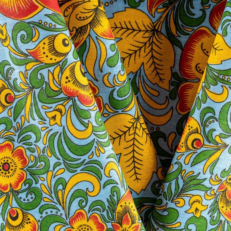 Плотная натуральная ткань с особым принципом переплетения нитей: крест-накрест. Имеет гладкую матовую поверхность, немного шероховатая на ощупь, не тянется, немного просвечивает. Прочная и стойкая к износу, надолго сохраняет яркость красок, практически не мнется. Яркий узнаваемый принт по мотивам народного творчества на голубом фоне прекрасно подойдет для пошива постельного и столового белья, изготовления сценических костюмов, домашней одежды и других предметов интерьера.