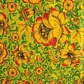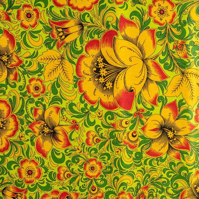 Плотная натуральная ткань с особым принципом переплетения нитей: крест-накрест. Имеет гладкую матовую поверхность, немного шероховатая на ощупь, не тянется, немного просвечивает. Прочная и стойкая к износу, надолго сохраняет яркость красок, практически не мнется. Яркий узнаваемый принт по мотивам народного творчества на салатово-зеленом фоне прекрасно подойдет для пошива постельного и столового белья, изготовления сценических костюмов, домашней одежды и других предметов интерьера.