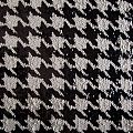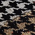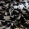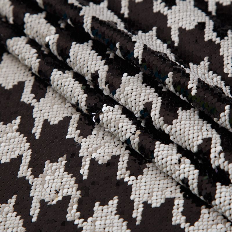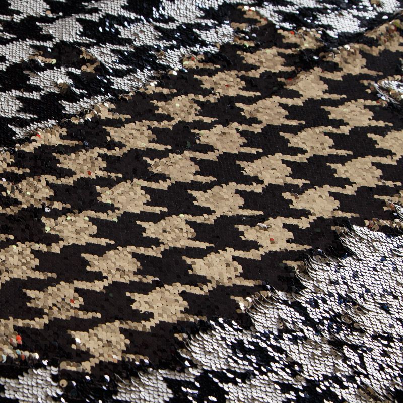 Итальянские двусторонние пайетки на трикотажной сетке с классическим принтом пье-де-пуль. Пайетки черно-белые, белые открываются золотом, двигаются по горизонтали - от кромки к кромке.