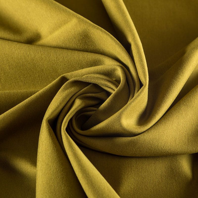 Эластичный, плотный хлопковый трикотаж темного оттенка горчицы. Поверхность ткани гладкая и матовая, с изнанки - с шелковистым мягким ворсом. Материал упругий, имеет растяжимость по всем сторонам, не просвечивается, хорошо держит форму, уютный, приятный к телу и удобный в носке. Применяется в пошиве костюмов, жакетов, кардиганов, платьев и юбок.