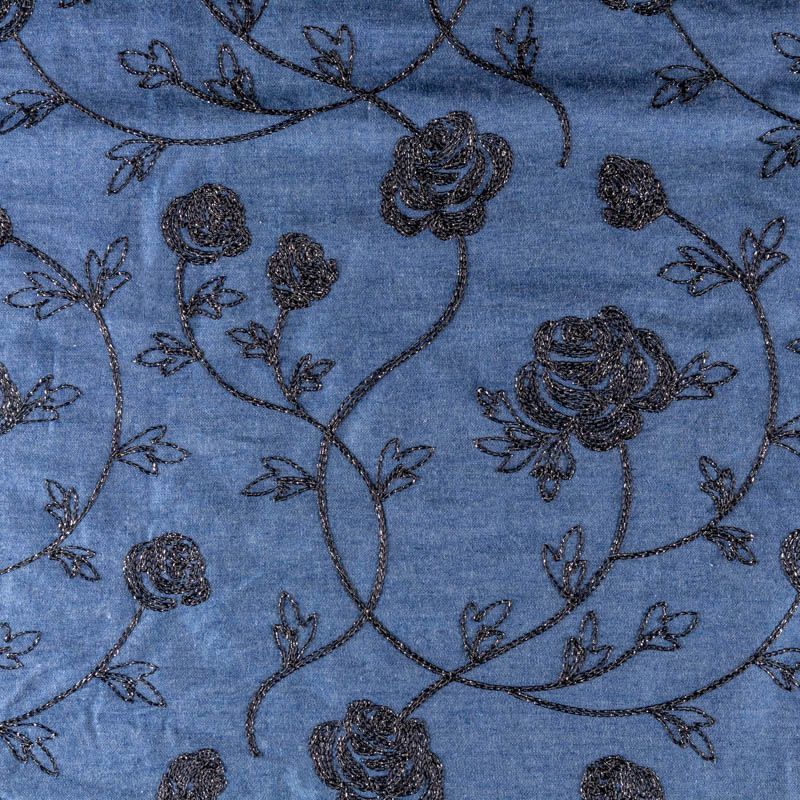 На сине-голубом фоне цветы, вышитые черной металлизированной нитью. Полотно легкое, средней плотности, очень пластичное, не держит форму.  Материал отлично драпируется, формируя мягкие складки. Подойдет для прямых, расклешенных платьев, сарафанов, платья-рубашки, юбки или туники.