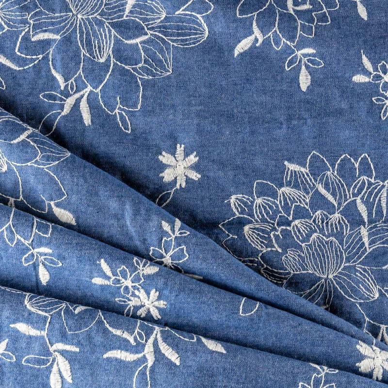 На сине-голубом фоне цветы, вышитые белой нитью со сдержанным атласным блеском. Полотно легкое, средней плотности, очень пластичное, не держит форму. Материал отлично драпируется, формируя мягкие складки. Подойдет для прямых, расклешенных платьев, сарафанов, платья-рубашки, юбки или туники.