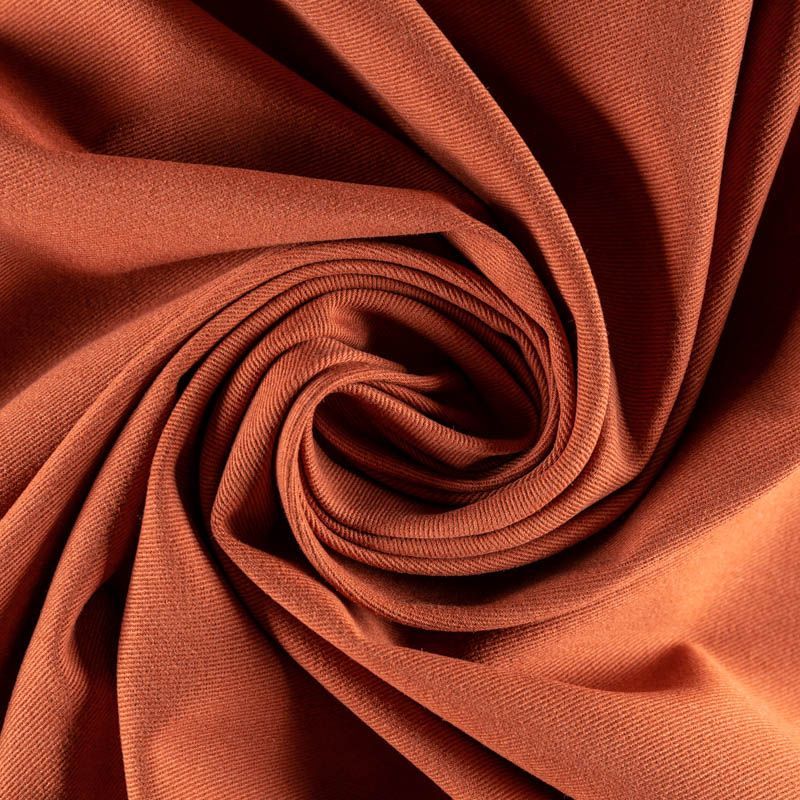 Поверхность ткани матовая, фактурная в диагональный рубчик. Материал имеет высокую плотность, при небольшой толщине, мягкий и приятный на ощупь, обладает устойчивостью к истиранию и механическим повреждениям. Подойдет для пошива рубашек, сарафанов, платьев, юбок, шорт, брюк-джоггеров, лёгких курток и жакетов.