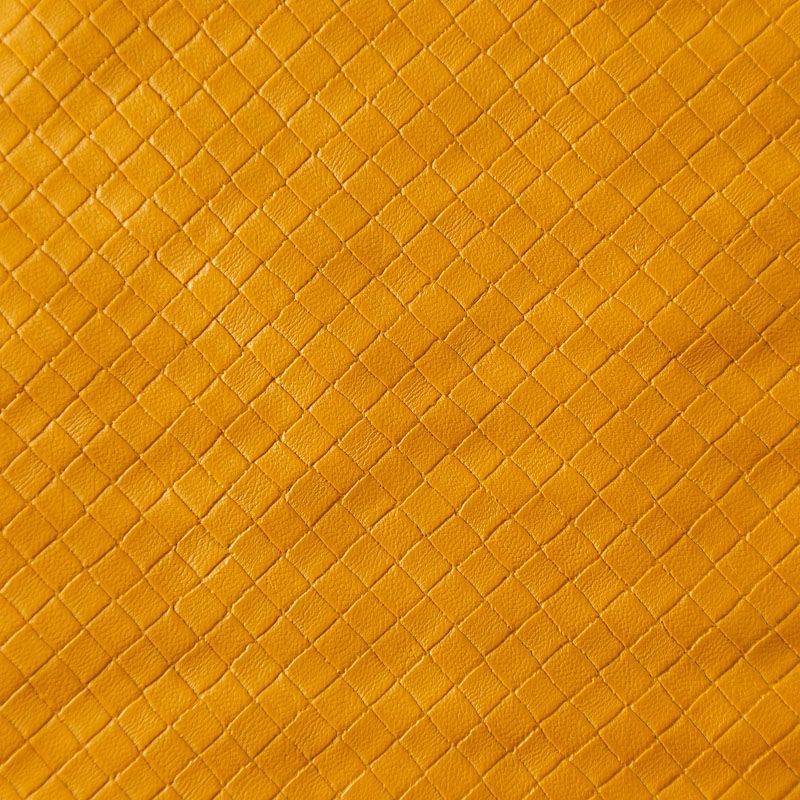 Экокожа в желтом оттенке с объемной фактурой, имитирующей плетенку. Очень приятная на ощупь, пластичная. Подойдет для пошива платья, брюк, шорт, юбки, куртки, плаща, пальто-рубашки, а также сумки, рюкзака и других аксессуаров.
