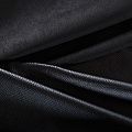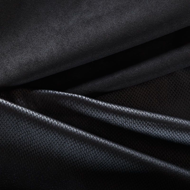 Искусственный материал, имитирующий рисунок змеиной кожи черного цвета на лицевой стороне и черной замши на изнаночной. Приятная и мягкая на ощупь, тянется за счет эластана в составе, не просвечивает, пластичная, хорошо драпируется. Подойдет для пошива куртки, костюма, платья, юбки, брюк, шорт, комбинезона, сумки, рюкзака.