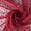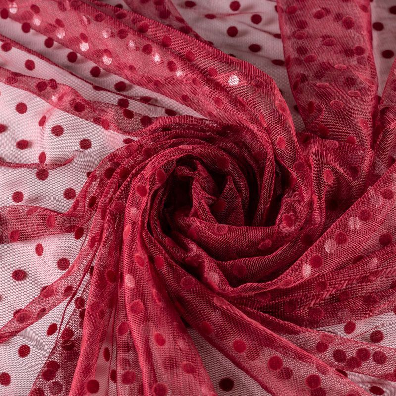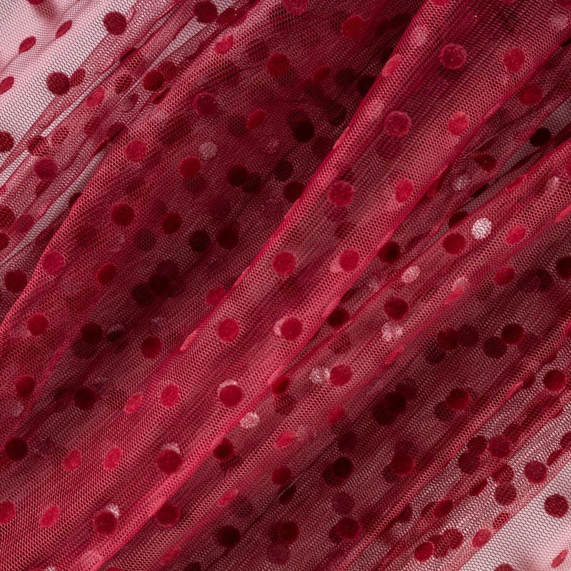 Нежный, мягкий и матовый фатин вишневого цвета. На лицевой стороне  объемные декоративные горошки среднего размера из флока. Хорошо драпируется, имеет мелкое сетчатое плетение, прияный на ощупь. Из него получатся нежные и воздушные наряды — пышные юбки-пачки, коктельные или вечерние платья.