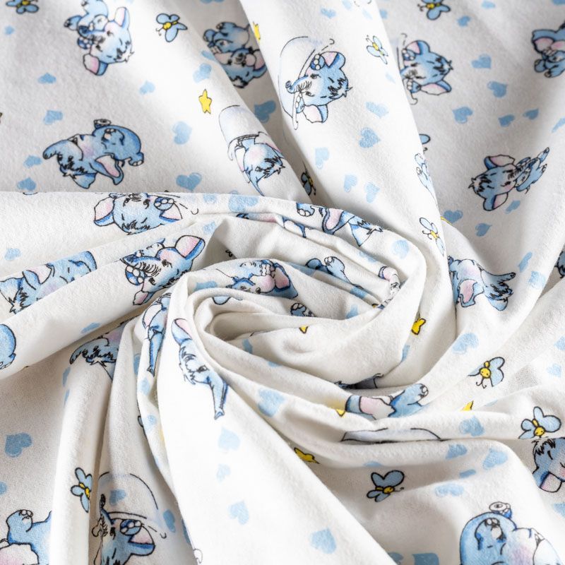 Износостойкий мягкий материал, не раздражает кожу, не садится, отлично впитывает влагу и хорошо удерживает тепло. На лицевой стороне мягкий ворс. Милый детский принт в виде рисованных слоников на белом фоне прекрасно подойдет для пошива постельного белья, изготовления пеленок, бортиков для кроватки, домашней одежды, пижамы и других предметов интерьера.