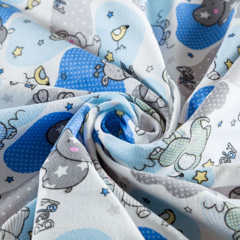 Износостойкий мягкий материал, не раздражает кожу, не садится, отлично впитывает влагу и хорошо удерживает тепло. На лицевой стороне мягкий ворс. Милый детский принт в виде рисованных тропических животных на белом фоне прекрасно подойдет для пошива постельного белья, изготовления пеленок, бортиков для кроватки, домашней одежды, пижамы и других предметов интерьера.
