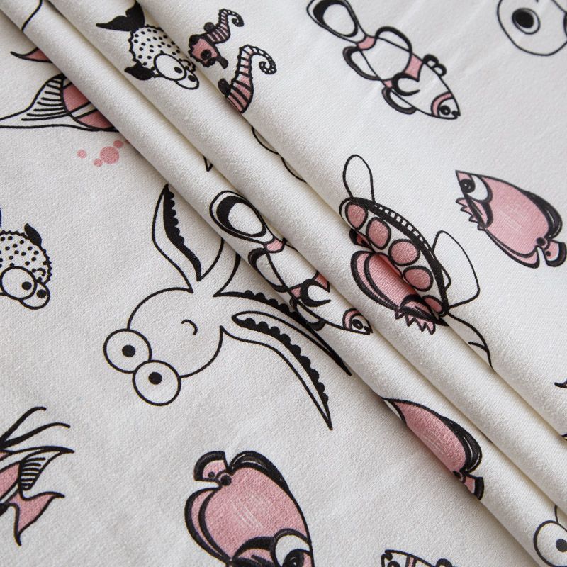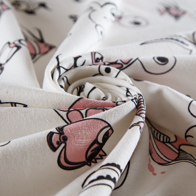 Итальянский хлопковый мягкий эластичный трикотаж средней плотности. Лицевая сторона гладкая, без блеска, мелкой вязки с детским принтом. Изнанка – с небольшим однородным ворсом или петля. Прекрасный вариант для пошива платьев и костюмов, легких толстовок, свитшотов, спортивной, детской и  домашней одежды.