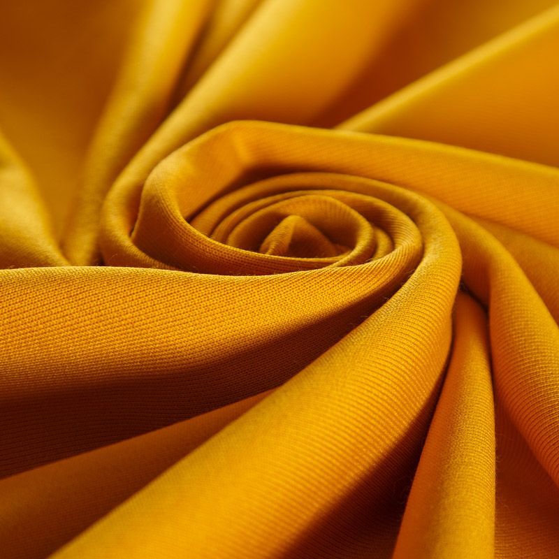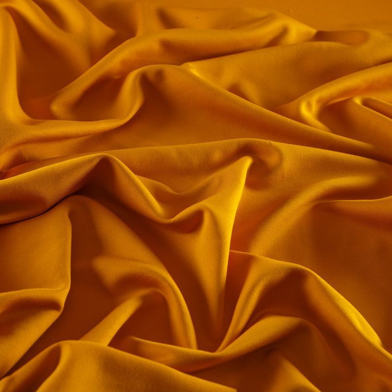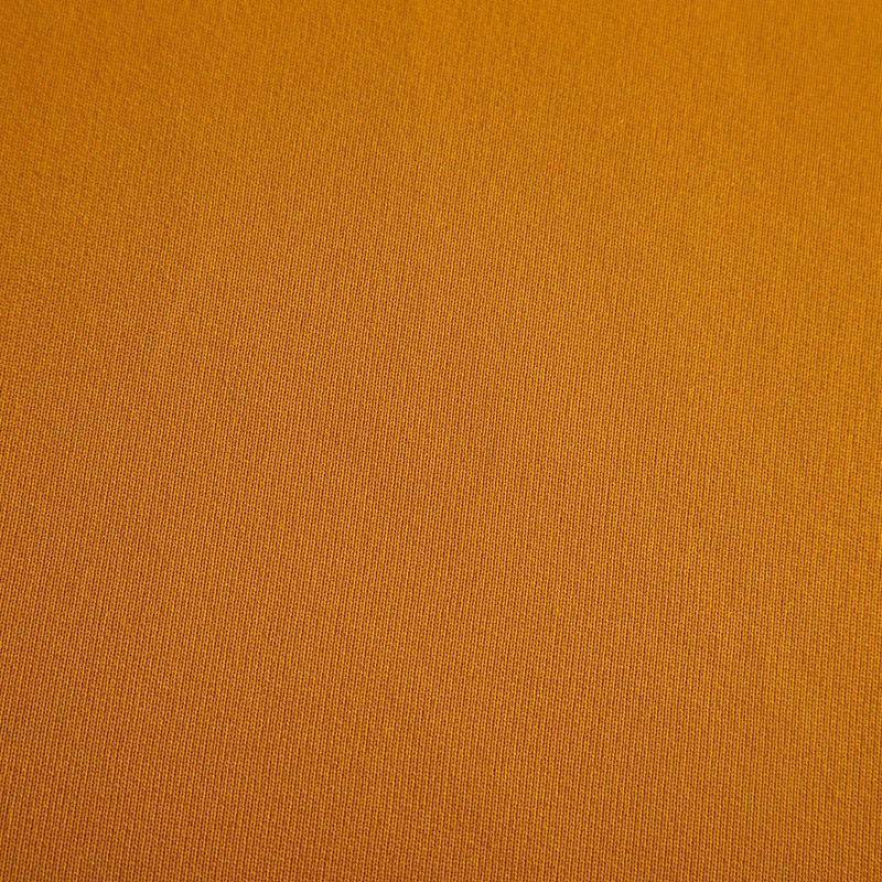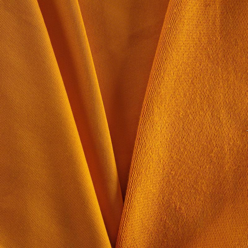 Итальянский хлопковый мягкий, но плотный эластичный трикотаж в оранжевом оттенке. Лицевая сторона гладкая, без блеска, мелкой вязки. Изнанка – с небольшим однородным ворсом или петля. Прекрасный вариант для пошива платьев и костюмов, легких толстовок, свитшотов, спортивной, детской и  домашней одежды.