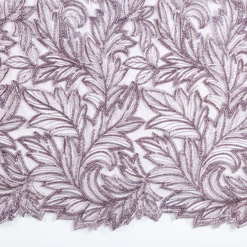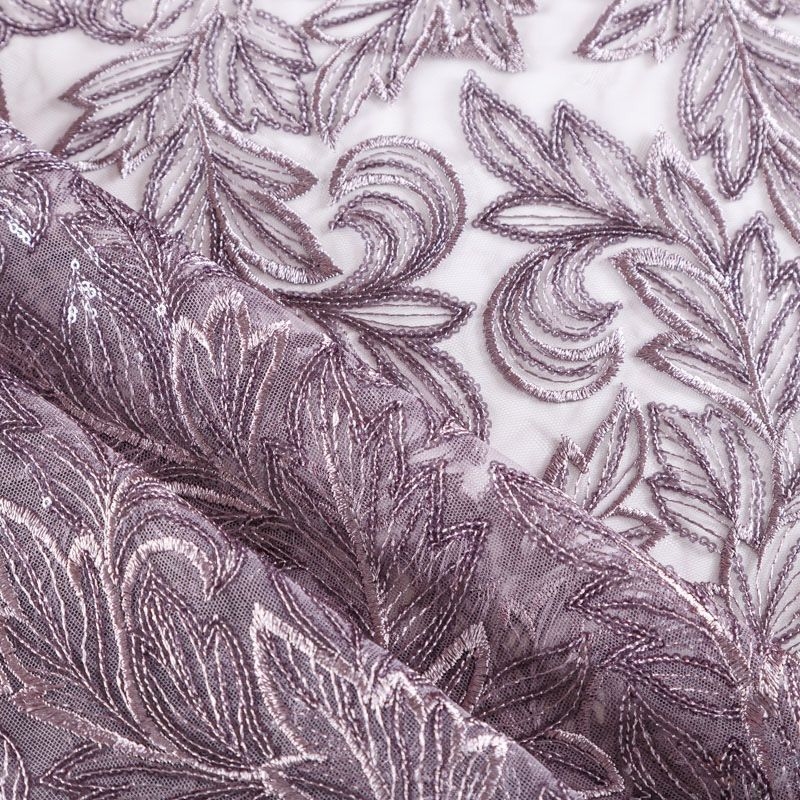Кружевное полотно на сетчатой основе сиреневого оттенка с растительным узором, расположенным по ширине ткани. Тонкое, легкое, очень мягкое и пластичное, хорошо драпируется, приятное тактильно. Вышивка дополнена глянцевыми пайетками в тон. С обеих сторон ткань украшена симметричными фестонами, что придает полотну законченный и нарядный вид. Великолепно будет смотреться в нарядном вечернем, свадебном платье, платье на выпускной бал, в юбках, блузках, топах. На изделие набирается объемом.