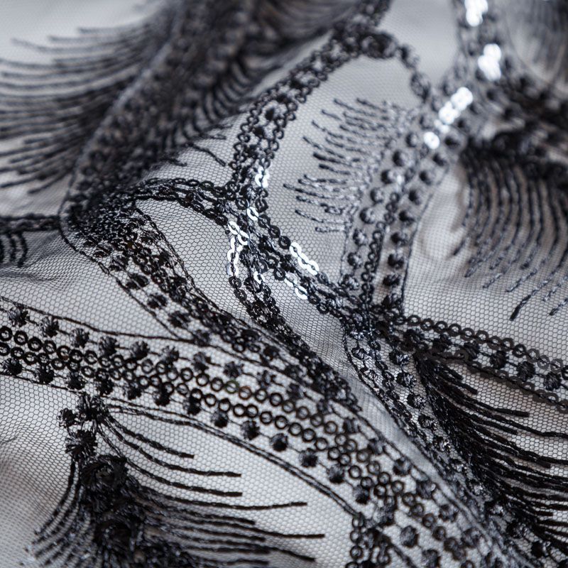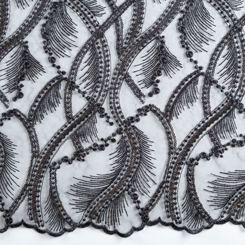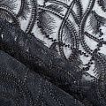 Кружевное полотно на сетчатой основе черного цвета с абстрактным узором, расположенным по ширине ткани. Тонкое, легкое, очень мягкое и пластичное, хорошо драпируется, приятное тактильно. Вышивка дополнена глянцевыми пайетками в тон. С обеих сторон ткань украшена симметричными фестонами, что придает полотну законченный и нарядный вид. Великолепно будет смотреться в нарядном вечернем, свадебном платье, платье на выпускной бал, в юбках, блузках, топах. На изделие набирается объемом.