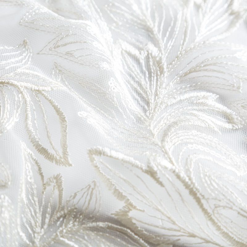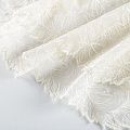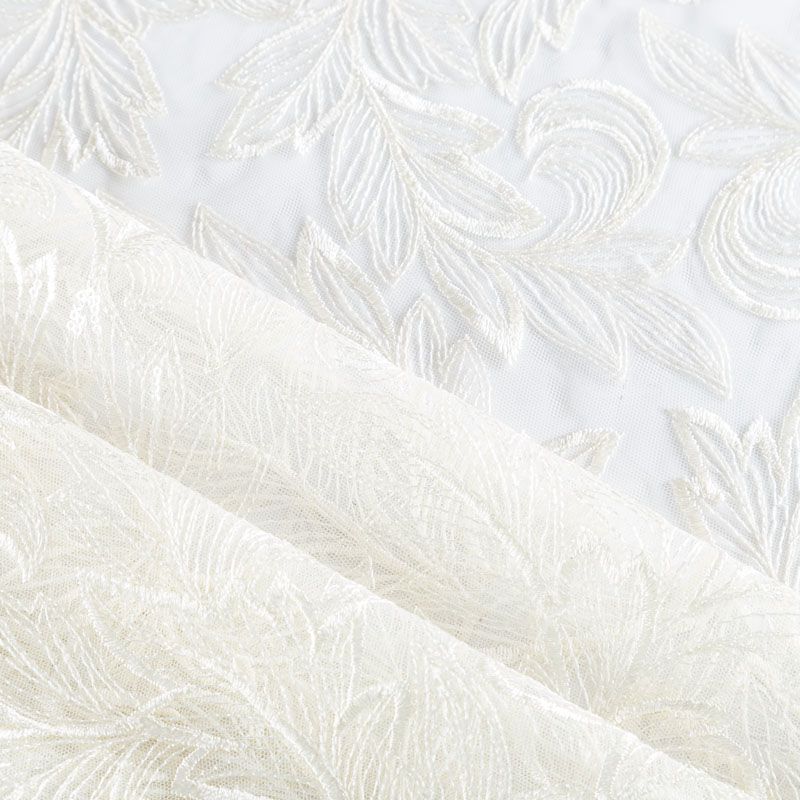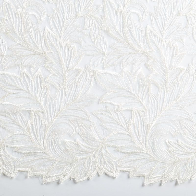 Кружевное полотно на сетчатой основе молочного оттенка с растительным узором, расположенным по ширине ткани. Тонкое, легкое, очень мягкое и пластичное, хорошо драпируется, приятное тактильно. Вышивка дополнена глянцевыми пайетками в тон. С обеих сторон ткань украшена симметричными фестонами, что придает полотну законченный и нарядный вид. Великолепно будет смотреться в нарядном вечернем, свадебном платье, платье на выпускной бал, в юбках, блузках, топах. На изделие набирается объемом.