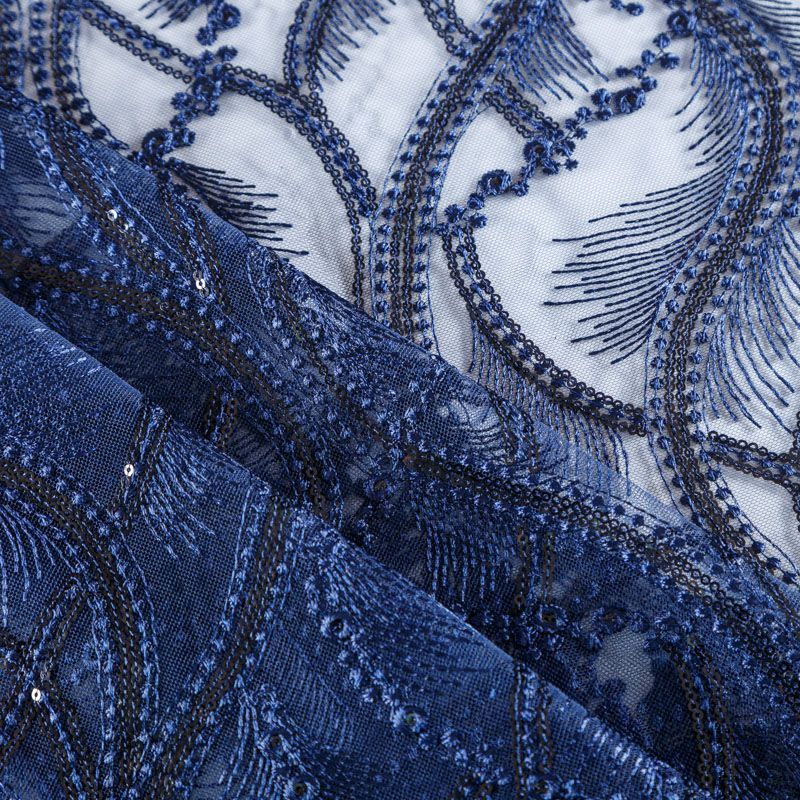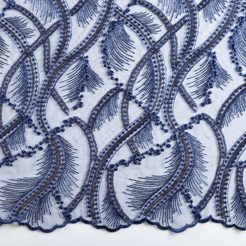 Кружевное полотно на сетчатой основе темно-синего оттенка с абстрактным узором, расположенным по ширине ткани. Тонкое, легкое, очень мягкое и пластичное, хорошо драпируется, приятное тактильно. Вышивка дополнена глянцевыми пайетками в тон. С обеих сторон ткань украшена симметричными фестонами, что придает полотну законченный и нарядный вид. Великолепно будет смотреться в нарядном вечернем, свадебном платье, платье на выпускной бал, в юбках, блузках, топах. На изделие набирается объемом.