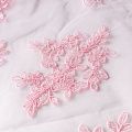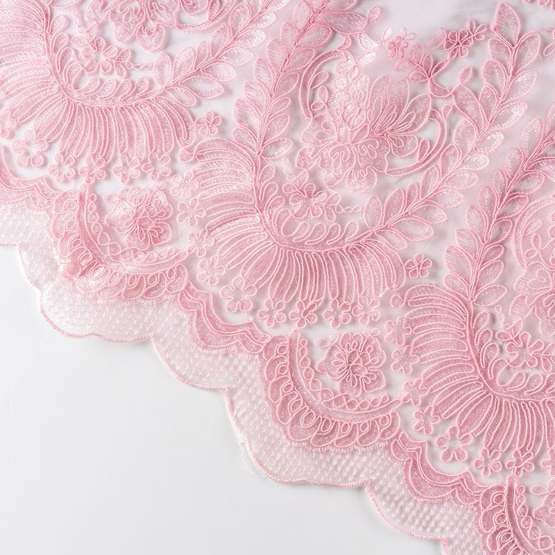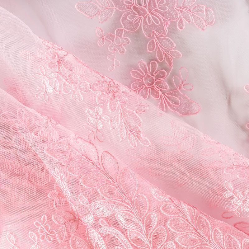 Вышивка на сетке розового цвета с оттеном персика с крупным флористическим узором. Полотно мягкое, легкое и пластичное, хорошо тянется. Сетка не жесткая, приятная к телу. Узор вышит мягкой пряжей, образуя красивую фактуру, имитирующую ручную вышивку, и оформлен кордовой нитью. С обеих сторон ткань украшена симметричными фестонами, что придает полотну законченный и нарядный вид. Великолепно будет смотреться в нарядном вечернем, свадебном платье, платье на выпускной бал, в юбках, блузках, топах. Набирается для изделя объемом.