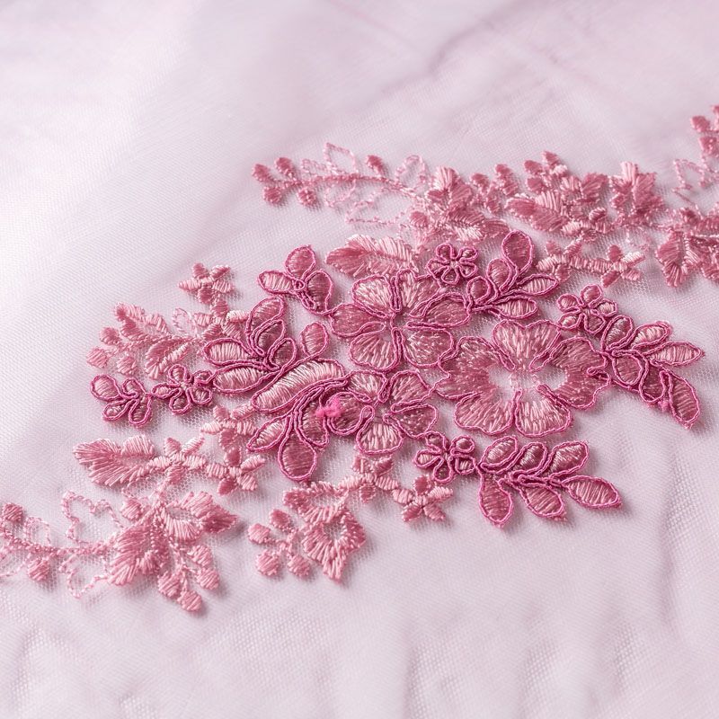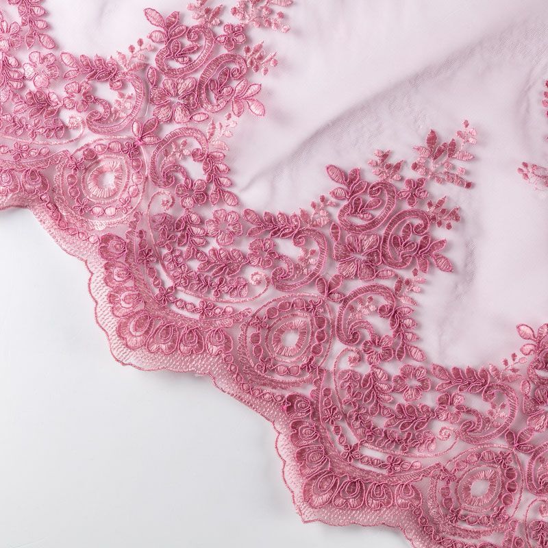 Вышивка на сетке темно-розового оттенка с флористическим узором. Полотно мягкое, легкое и пластичное, хорошо тянется. Сетка не жесткая, приятная к телу. Узор вышит мягкой пряжей, образуя красивую фактуру, имитирующую ручную вышивку, и оформлен кордовой нитью. С обеих сторон ткань украшена симметричными фестонами, что придает полотну законченный и нарядный вид. Великолепно будет смотреться в нарядном вечернем платье, платье на выпускной бал, в юбках, блузках, топах. Набирается для изделя объемом.