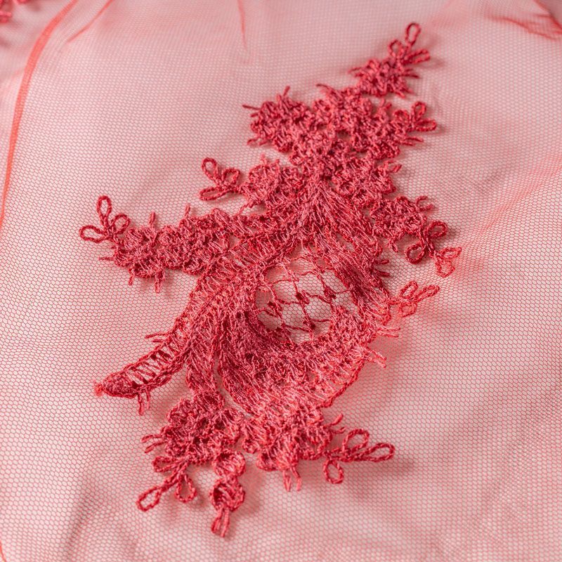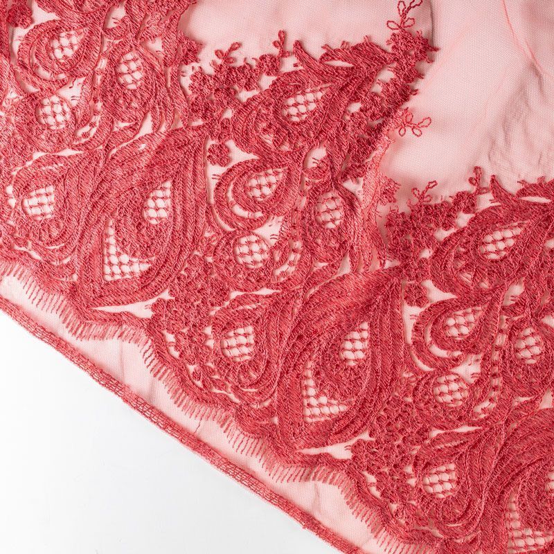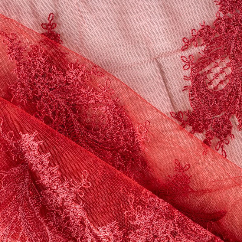 Вышивка на сетке красного цвета с багровым оттенком с крупным фантазийным узором в виде пера жар-птицы. Полотно мягкое, легкое и пластичное, хорошо тянется. Сетка не жесткая, приятная к телу. Узор вышит мягкой пряжей, образуя красивую фактуру, имитирующую ручную вышивку, и оформлен кордовой нитью. С обеих сторон ткань украшена симметричными фестонами, что придает полотну законченный и нарядный вид. Великолепно будет смотреться в нарядном вечернем платье, платье на выпускной бал, в блузках, топах. Набирается для изделя объемом.