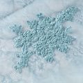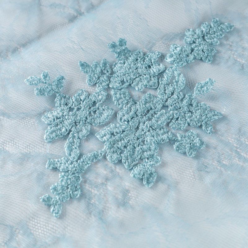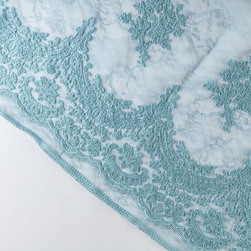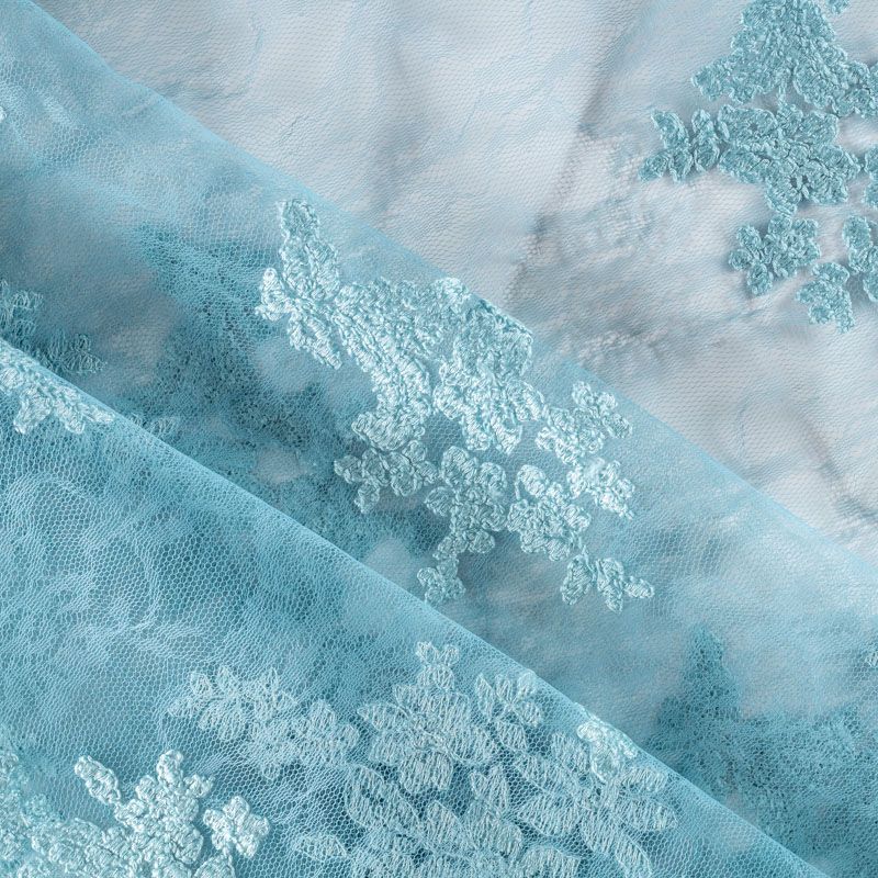 Итальянский гипюр с воздушным кружевным орнаментом, который соединяет прозрачная тонкая сетка пыльно-голубого оттенка. Вышивка выполнена вискозной нитью не очень плотно, поэтому полотно тонкое, легкое, очень мягкое и пластичное, хорошо драпируется, приятное тактильно. С обеих сторон ткань украшена симметричными фестонами, что придает ей законченный и нарядный вид. Великолепно будет смотреться в нарядном вечернем, свадебном платье, платье на выпускной бал, в юбках, блузках, топах.