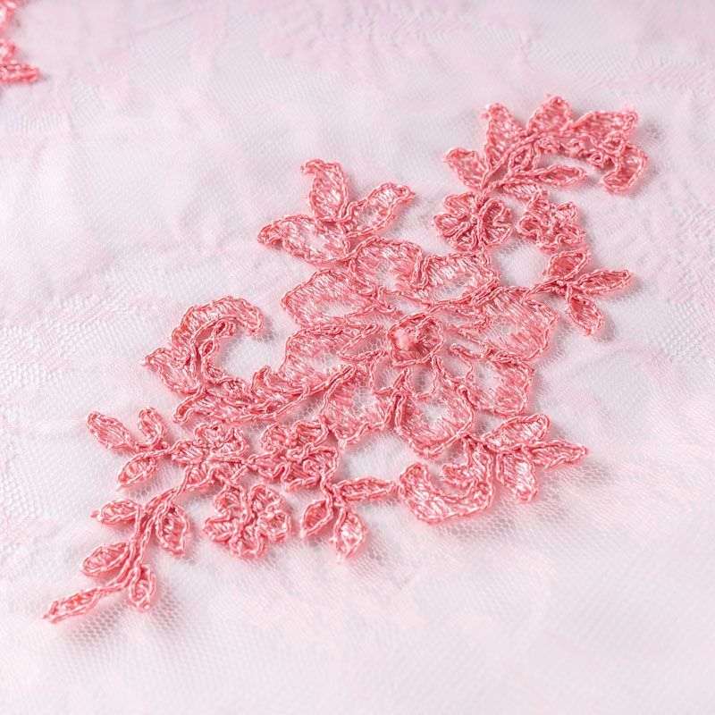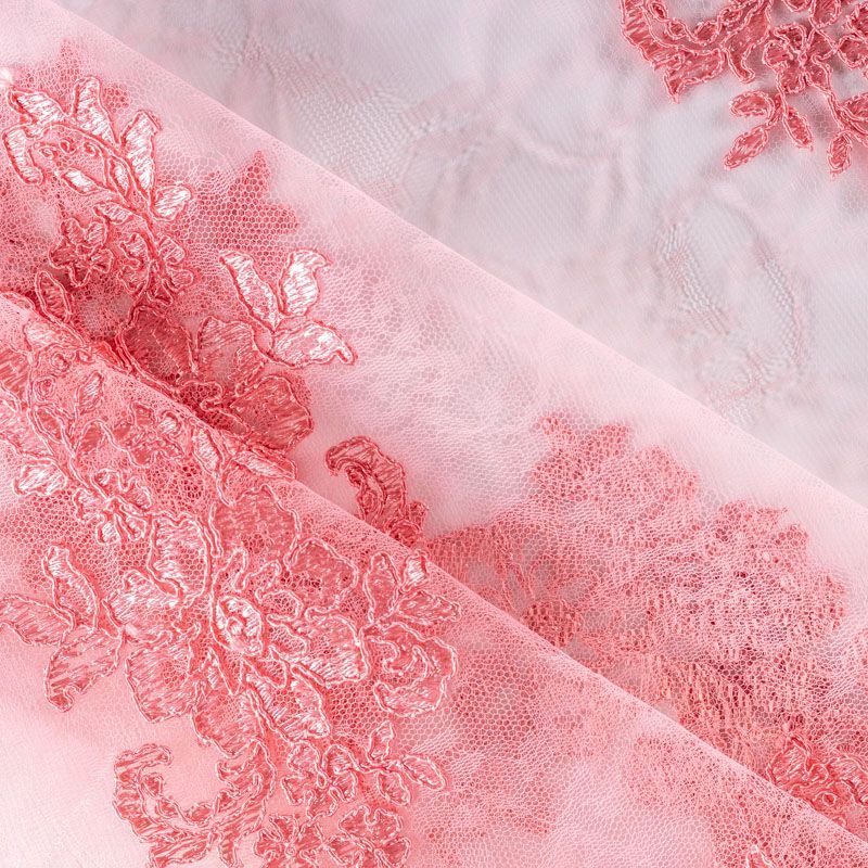 Кружевное полотно на сетчатой жаккардовой основе яркого корралового оттенка с флористическим узором. Тонкое, легкое, очень мягкое и пластичное, хорошо драпируется, приятное тактильно. Вышивка оформлена кордовой нитью. С обеих сторон ткань украшена симметричными фестонами, что придает полотну законченный и нарядный вид. Великолепно будет смотреться в нарядном вечернем, свадебном платье, платье на выпускной бал, в юбках, блузках, топах. Также можно применять отдельные элементы для декора, которые вырезаются из полотна.