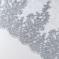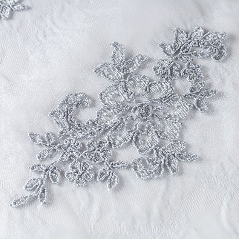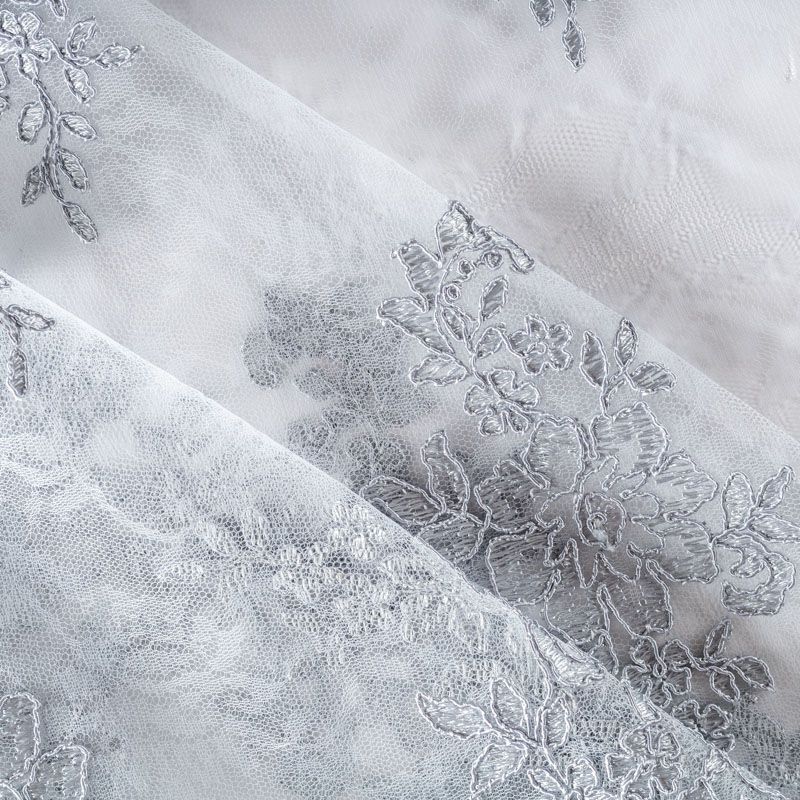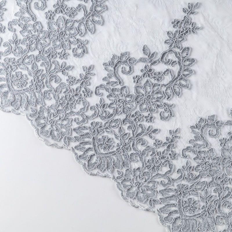 Кружевное полотно на сетчатой жаккардовой основе жемчужно-серого оттенка с флористическим узором. Тонкое, легкое, очень мягкое и пластичное, хорошо драпируется, приятное тактильно. Вышивка оформлена кордовой нитью. С обеих сторон ткань украшена симметричными фестонами, что придает полотну законченный и нарядный вид. Великолепно будет смотреться в нарядном вечернем, свадебном платье, платье на выпускной бал, в юбках, блузках, топах. Также можно применять отдельные элементы для декора, которые вырезаются из полотна.