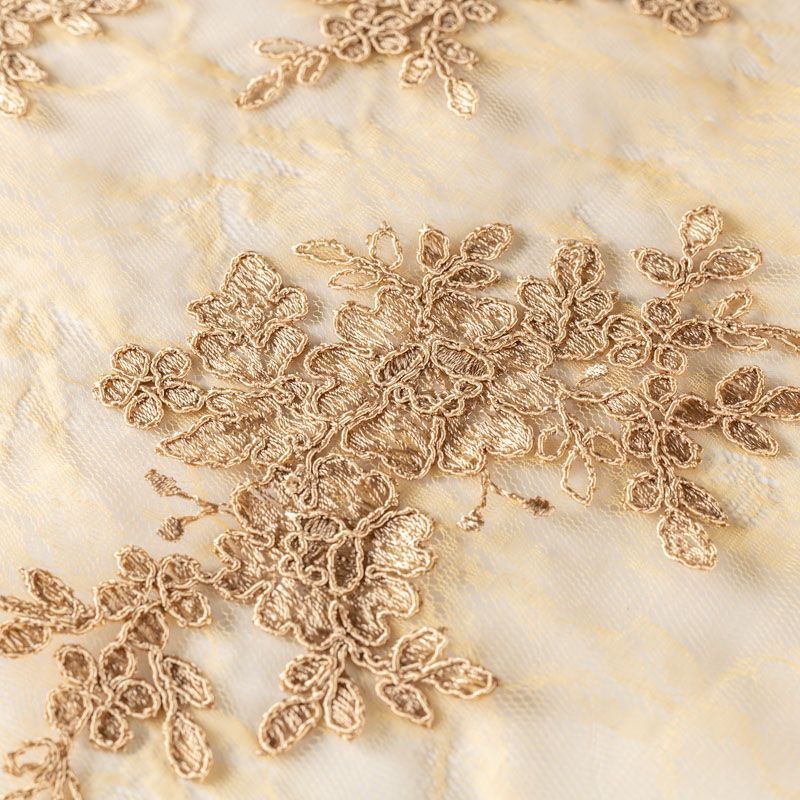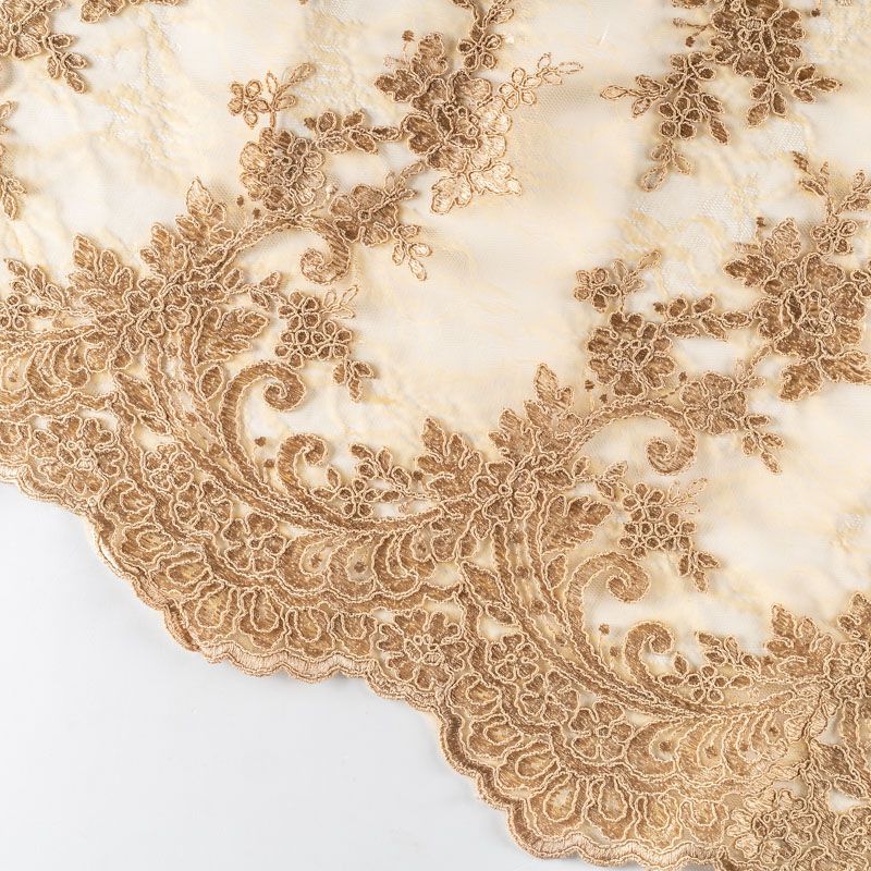 Кружевное полотно на сетчатой жаккардовой основе теплого карамельного оттенка с флористическим узором. Тонкое, легкое, очень мягкое и пластичное, хорошо драпируется, приятное тактильно. Вышивка оформлена кордовой нитью. С обеих сторон ткань украшена симметричными фестонами, что придает полотну законченный и нарядный вид. Великолепно будет смотреться в нарядном вечернем, свадебном платье, платье на выпускной бал, в юбках, блузках, топах. Также можно применять отдельные элементы для декора, которые вырезаются из полотна.