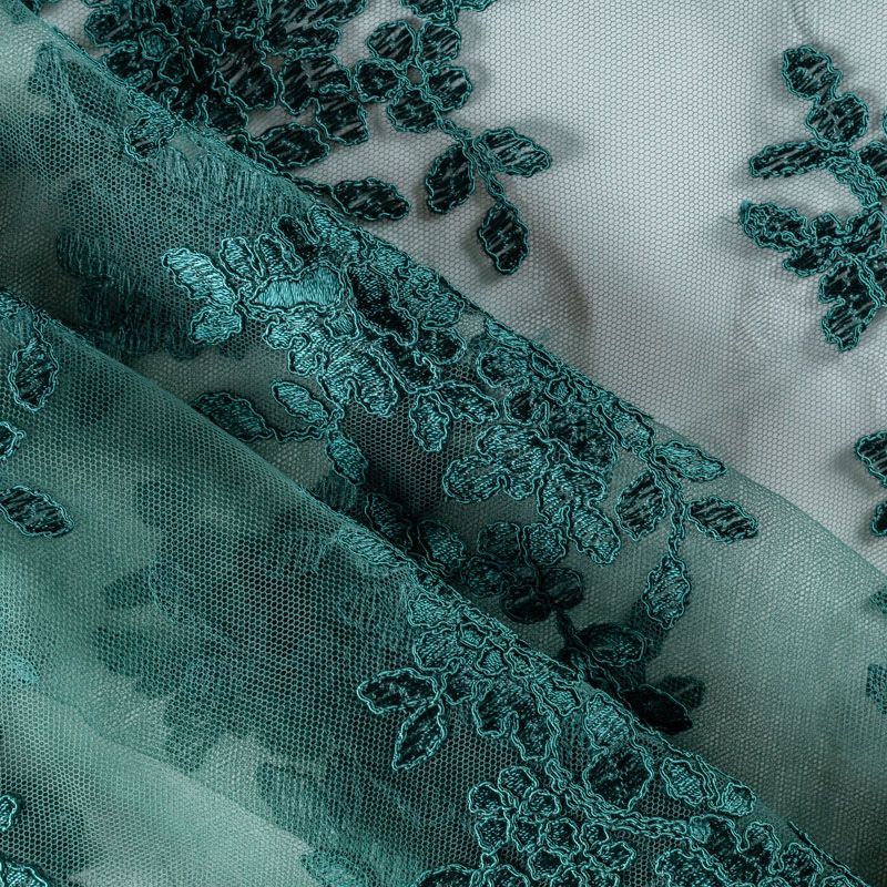 Вышивка на сетке темно-зеленого оттенка с флористическим узором. Полотно мягкое, легкое и пластичное, хорошо тянется. Сетка не жесткая, приятная к телу. Узор вышит мягкой пряжей, образуя красивую фактуру, имитирующую ручную вышивку, и оформлен кордовой нитью. С обеих сторон ткань украшена симметричными фестонами, что придает полотну законченный и нарядный вид. Великолепно будет смотреться в нарядном вечернем платье, платье на выпускной бал, в блузках, топах. Набирается для изделя объемом.