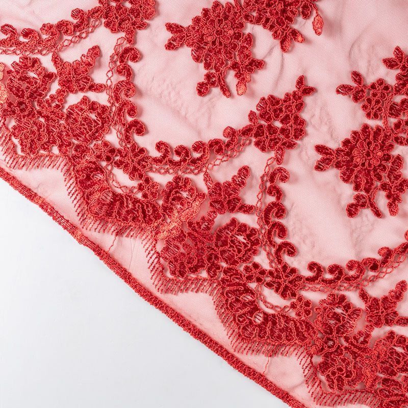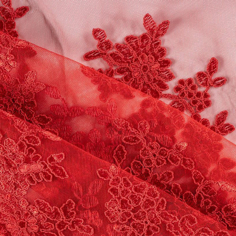 Вышивка на сетке насыщенного красного оттенка с флористическим узором. Полотно мягкое, легкое и пластичное, хорошо тянется. Сетка не жесткая, приятная к телу. Узор вышит мягкой пряжей, образуя красивую фактуру, имитирующую ручную вышивку, и оформлен кордовой нитью. С обеих сторон ткань украшена симметричными фестонами, что придает полотну законченный и нарядный вид. Великолепно будет смотреться в нарядном вечернем платье, платье на выпускной бал, в блузках, топах. Набирается для изделя объемом.